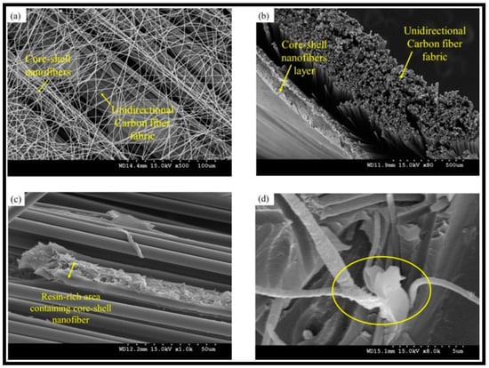 Neisiany et al. firstly encapsulated an epoxy and amine-based curing agent within the PAN nanofibers [71] and incorporated them between the carbon layers of carbon/epoxy composites. They evaluated the effect of the nanofiber’s incorporation on the mechanical properties and self-healing behavior of the composite. In the next study, they encapsulated an epoxy and amine-based curing agent within the nanofiber with poly(styrene-co-acrylonitrile) (SAN) as the shell [68]. Their results showed that the use of SAN as the shell provided a higher amount of encapsulation as well as a high encapsulation yield. However, the high amount of healing agent did not improve the self-healing performance in comparison with the PAN nanofiber. Figure 9 shows the morphology of the prepared nanofibers on the surface of carbon fibers and in the carbon/epoxy composites. In their next research, they again encapsulated an epoxy resin and amine-based curing agent in the poly(methyl methacrylate) (PMMA) shell. The hybrid carbon/epoxy composite with this type of core-shell nanofibers showed higher self-healing performance. From the results, Neisiany et al. concluded that for composites reinforced with core-shell nanofibers, the diameter of the prepared nanofibers has a significant effect on improving the out-of-plane mechanical properties of the laminated composites, whereas the mechanical properties (strain at break) of the nanofibers dictate the improvement of the in-plane properties of the composites and self-healing performance. In addition, they claimed the incorporation of the core-shell nanofibers did not have a remarkable effect on the impact properties of the hybrid composites.