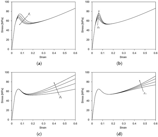 Figure 1. Effects of the model parameters (a) , (b) , (c) , (d) on the softening and hardening behavior; arrows indicate the value increase of the respective parameters. - The strain hardening-associated model parameters , , , , and control the evolution of the internal variable . According to Equation (11), and are used to compute the state variable , while and are used to compute the state variable . Figure 1c,d shows how the parameters and affect the strain hardening behavior of amorphous polymers. , , and are determined from the experimental stress-strain response at the reference temperature , while and are determined from the experimental stress-strain response at different temperatures.