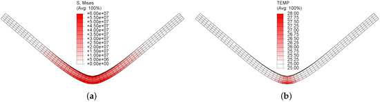 Figure 5 shows the von Mises stress and temperature contour plots on the polycarbonate beam at the maximum deformation. As can be seen from the figure, the strain and rotation on the beam was relatively large. The von Mises stress reached approximate 60 MPa at the central part of the beam, and the elements at the top layer were subjected to compressive loadings, while the bottom layer was subjected to tensile loadings. At such a stress level, the material had entered the viscoplastic regime. According to Equation (15), the intrinsic dissipation due to the viscoplastic deformation will partially convert to heat and therefore lead to a temperature rise on the beam, as shown in Figure 5b. Here, the maximum temperature rise was around 3 °C.