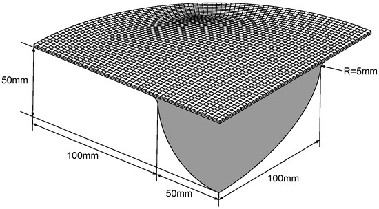 In order to show the model’s capability of capturing the intricate behavior of amorphous glassy polymer during the warm mechanical process, we applied the model to simulate the gas-blow forming process of the polycarbonate sheet, which underwent large viscoplastic deformation at a temperature slightly lower than the glassy transition temperature. Figure 6 shows the analytical model adopted in the simulation. It is noted that, in consideration of the structural symmetry, we only created a quarter of the entire model. The element type for the sheet was C3D8RT (temperature-displacement coupled element), and the forming die was R3D4 (discrete rigid element). The boundary conditions and loading are given as follows: the side edges of the sheet were fully restricted; a uniform temperature was initially prescribed on the sheet; and the upper surface of the sheet was loaded with an increasing gas pressure.