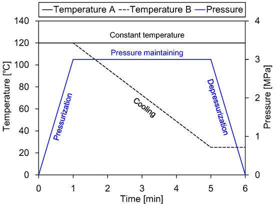 The thermomechanical loading cases considered in the gas-blow forming simulations are shown in Figure 7. Gas pressure was increased from zero to 3 MPa in the first minute (pressurization stage), then kept constant in the next four minutes (pressure-maintaining stage) and finally decreased back to zero in the last minute (depressurization stage). For the temperature, a constant value of 120 °C was kept throughout the simulation in the first loading case, while decreasing from 120 °C–25 °C at the pressure maintaining stage in the second loading case.