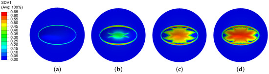 Figure 8 shows the viscoplastic strain contour plot on the deformed polycarbonate sheet at gas pressure levels of 1.0 MPa, 1.5 MPa, 2.0 MPa, and 3.0 MPa. As we can see from the figure, the viscoplastic strain firstly took place along the edge of the ellipse when the gas pressure was increased to 1.0 MPa. Then, with the increasing gas pressure, the central part of the sheet began to display viscoplasticity, and the deformed area gradually expanded outward. Finally, when the gas pressure reached the maximum value of 3.0 MPa, the viscoplastic strain contour plot formed a butterfly shape. The maximum viscoplastic strain was around 65%, which had definitely entered the finite-strain regime.
