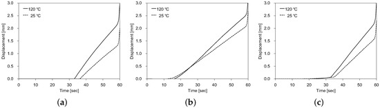 Figure 9 shows the spring back displacement of the polycarbonate sheet during the depressurization process in both loading cases. Here, three representative points were considered: center point, midpoint of major semiaxis, and midpoint of minor semiaxis. As we mentioned above, in the first loading case, the temperature was maintained at 120 °C during the depressurization process; while in the second loading case, the temperature was cooled down from 120 °C–25 °C before the depressurization process. According to Equation (4), the elastic modulus of amorphous glassy polymer strongly depends on the temperature. Specifically, when the temperature is decreased, it grows proportionally. As depressurization is approximately an elastic unloading process, the larger elastic modulus in the second loading case produced a smaller spring back deformation, as shown in Figure 9. For a 2 mm-thick polycarbonate sheet, the maximum spring back deformation was about 3 mm.