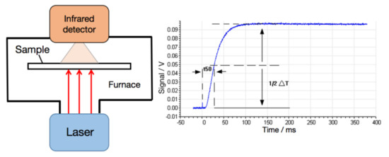 The thermal diffusion coefficient was measured under the N2 atmosphere of 50 mL/min using the laser flash technique (LFA 467 HT HyperFlash, NanoFlash, Netzsch, Seelze, Germany). The testing principle is shown in Figure 1. Every film was cut into a square with size of 10 mm × 10 mm. At the preset temperature, a pulse of light was transmitted instantaneously by the laser source and irradiated on the surface of the sample uniformly. The surface temperature was raised after absorbed light energy, and the energy was transmitted to the cold end. The infrared detector was used to continuously measure the corresponding temperature rise process of the central part of the upper surface of the sample. The curve of temperature as a function of time was obtained. The thermal diffusivity was obtained from equation: α = 0.1388 × d2/t1/2, in which d was the thickness of the sample and t1/2 was semi-temperature rising time, as exhibited in Figure 1. The specific heat of the sample was obtained by DSC 204 F1 Phoenix (Netzsch, Seelze, Germany), the density was measured using a real density meter with exhaust method. Thermal conductivity λ (W/mK) was calculated as a multiplication of density (ρ, g/cm3), specific heat (Cp, J/gK), and thermal diffusivity (α, mm2/s). Namely: λ(T) = α(T) × Cp(T) × ρ(T).