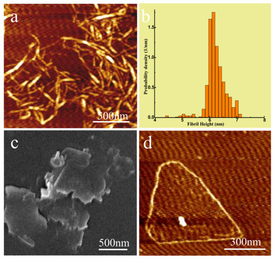 (a) AFM image of CNF, (b) The corresponding height distribution measured from AFM topographic data of CNF, (c) SEM Image of BNNS, (d) AFM image of BNNS.