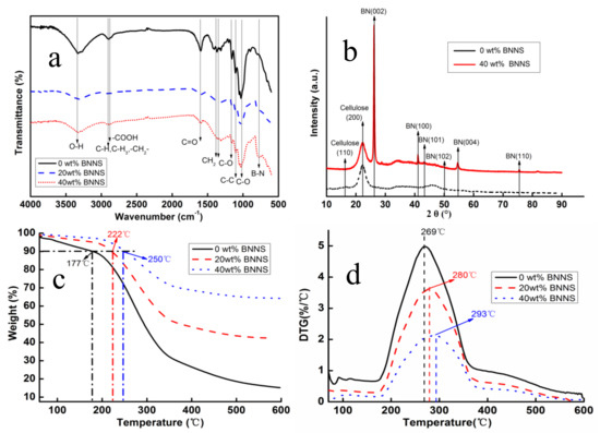 Figure 4c,d show the TG and DTG curves of BNNS/CNF aerogel nano-paper. Compared with the BNNS/CNF nano-paper, pure CNF nano-paper had the lower onset degradation temperature about 175 °C, owing to the carboxyl groups on the surface of CNF [37]. As can be seen in Figure 4c,d, the initial decomposition temperature and the maximum decomposition rate of the nano-paper gradually increased with the increase of BNNS loading in the nano-paper. It has been reported that pure h-BN exhibits high thermal stability on heating up to 800 °C under N2 atmosphere [38], suggesting that h-BN can effectively slow down the decomposition rate of nano-paper.