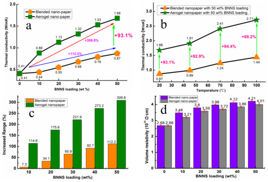 (a) Thermal conductivity of BNNS/CNF nano-paper, (b) The effects of temperature on BNNS/CNF nano-paper, (c) Increased range of thermal conductivity at 20 °C, (d) The effects of BNNS loading on volume resistivity of nano-paper.