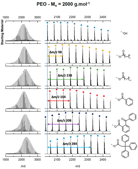 End-capped polymer characterization: In the present paper, we did not optimize the end-capping procedures, since using mass spectrometry, mass discrimination between end-capped and pristine macromolecules is readily achieved. Each functionalized polymer sample was analyzed by mass spectrometry (MS) using a Matrix-assisted Laser Desorption/Ionization (MALDI) ion source. Partial or quantitative functionalization was attested by the appearance of additional signals with adequate mass differences compared to the precursor α-methyl, ω-hydroxy polymers. For the sake of illustration, Figure 1 presents the MALDI mass spectra recorded for functionalized and non-functionalized PEOs with Mn = 2000 g mol−1.