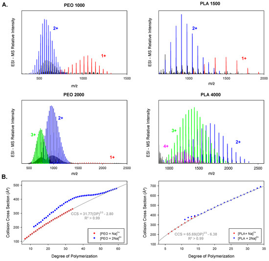(A) Electrospray (ESI) Mass spectra of α-methyl, ω-hydroxy-Poly(ethylene oxide) (PEO) 1000, poly(L-lactide) (PLA) 1500, PEO 2000, and PLA 4000. Detected ion series with different charge states, 1+, 2+, 3+, and 4+ are highlighted in different colors. (B) Collision cross section evolution of singly and doubly charged PEO and PLA ions as a function of the degree of polymerization (DP). Fittings of the data corresponding to globular structures (singly charged and doubly charged beyond the plateau) are shown in dark grey along with fitting equations and regression coefficients.