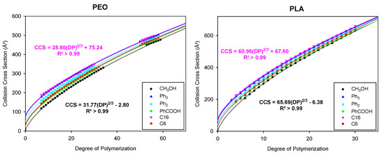 Whereas the CCS of singly charged oligomers increases steadily with growing DP, the CCS of doubly charged oligomers presents a non-monotonic evolution. This behavior is extensively described in the literature and is associated with different conformations for gaseous polymer ions [9,12,19,30]. Singly charged polymer ions fold around the cation to form a globule, while small multiply charged ions adopt stretched shapes due to the Coulombic repulsion of the complexed cations and are often described as “beads on a string” conformations [30]. Longer chains can screen the electrostatic repulsion and fold into globular species. The tipping point between stretched and globular conformations is characterized by a plateau in the CCS/DP or CCS/m/z evolution [9,12,19,30]. Here, we only fit the ion mobility data for the globular species, for which the constrained 2/3 power law is well established. We also use the equation, where A and B are free parameters, so that the possible contribution of the chain ends to the CCS is not neglected [24,25,26]. To strengthen the postulate that chain ends should not be ignored when fitting ion mobility data, α-methyl ω-hydroxyl PEO and PLA samples are functionalized on their hydroxy end groups by molecules of growing sizes, containing either aliphatic or aromatic groups (See Figure 1 and Table 1).