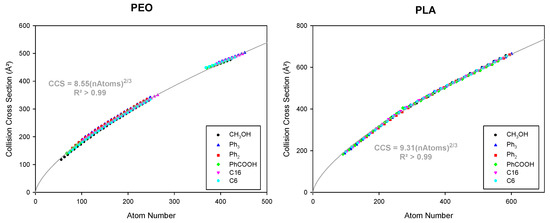 For the present data set, the impact of the structure of the chain ends on the A′ parameter remains weak, as confirmed by Figure 4, in which we combined the CCS data of all the PEO and PLA polymers as a function of the total atom numbers and by only considering the chain end contribution in terms of atom numbers. All data points of a given type of polymer align on one unique curve (regardless of the nature of the end-groups), meaning that the sole number of atoms in these end-groups seems to be a good estimate for their contribution, with no consideration of the chemical nature of these atoms.