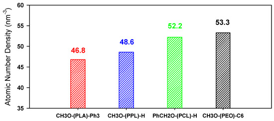 Therefore, by using the A′ parameter from each fitting presented in Figure 5, an atomic number density can subsequently be determined for each polymer family, as illustrated in Figure 6.