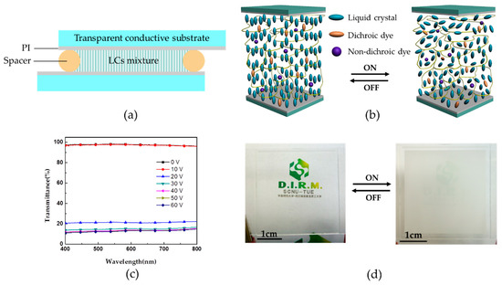 A cross-section of the PSLC cell is schematically shown in Figure 2a. PSLC layer doped with dyes was sandwiched by two transparent electrodes. The spacer was used to control the cell gap. A vertical alignment layer consisted of polyimide (PI) was coated on the transparent electrodes. The operating principle behind PSLC-based switchable smart windows involves the use of an alternating electric field to actuate PSLC film sandwiched between the two parallel transparent electrodes. Basically, in the voltage-off state, the LC directors exhibit a homeotropic state under the effect of vertical orientation polyimide alignment layer and are stabilized by the formed polymer network through the LC cell (Figure 2b). The incident light is transmitted, and the cell is transparent. In the voltage-on state, the LC directors with negative dielectric anisotropy tend to reorient and deviate from the vertically aligned position. LC molecules in the vicinity of the polymer strands keep their original orientations, while the bulk LC molecules reorient to various azimuthal and polar angles, resulting in randomly aligned poly-domain state (Figure 2b). The incident light is then strongly scattered due to the discontinuity of the refractive index between domains.