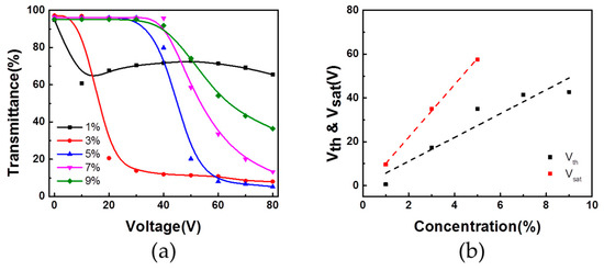 To investigate the effect of the polymer concentration on the electro-optical properties of the PSLC cells, several samples containing different concentrations of diacrylate LC monomer were prepared. The transmittance spectra were measured while incrementally increasing the AC voltage. The transmittance-voltage (T-V) curves of the samples are shown in Figure 3a. When the monomer concentration is 1%, the on-state transmittance is high, resulting in a low off/on contrast. When 3% monomer was used, the transmittance of the cell decreases along with the increased voltage. This suggests poly-domain scattering resulting from the reorientation of LC directors under an applied voltage. As the monomer concentration is increased from 3 to 9%, a larger threshold voltage (Vth) is required to switch on the cell, along with a larger saturation voltage (Vsat), which is clearly exhibited in Figure 3b. Here, the Vth and Vsat are, respectively, defined as the voltages at which 90% and 10% of the maximum transmittance of the cell in its voltage ramp-down transmittance curve [22]. The increase of Vth and Vsat might be due to the denser polymer network in the cell prepared with high monomer concentration, giving rise to an enhanced anchoring force, which affects the reorientation of the LC directors strongly against the applied voltage [23,24].