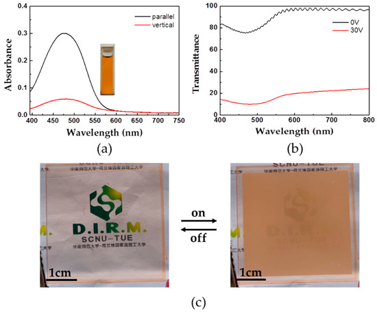 (a) Absorption spectra of the dye RL002. Red: the absorption of incident light that is polarized parallel vertical to the principal axes of the dye RL002, Black: the absorption of incident light that is polarized parallel to the principal axes of the dye RL002. The inset photographs show the color of the dye RL002 dissolved in dichloromethane; (b) Transmittance of dye RL002-doped polymer-stabilized liquid crystals (PSLC) sample in the off- and on-state; (c) The photograph of the PSLC sample in the off- and on-state (30 V). (Size, 4 × 4 cm).