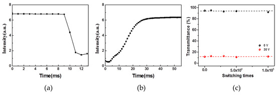 (a,b) The response time of polymer-stabilized liquid crystals (PSLC) device; (c) The transmittance of the PSLC device as a function of cycle times.