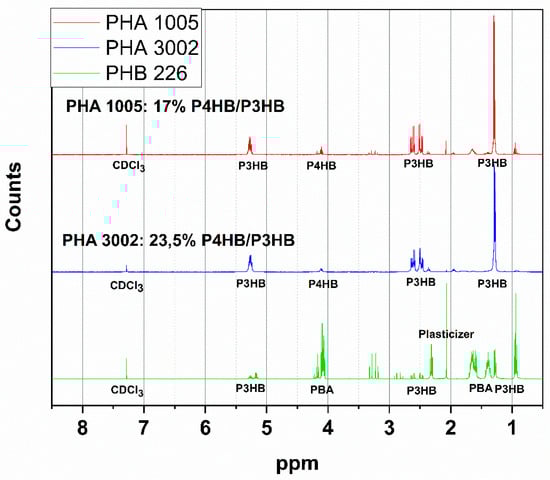 Nuclear magnetic resonance (NMR) spectra were measured on a Bruker instrument at 25 °C using 400 MHz for the three neat biopolymers (PHB226, PHA1005 and PHA3002) (Bruker, Karlsruhe, Germany). Samples were dissolved in CDCl3 and washed to clean them up from mineral fillers. 1H NMR spectra were obtained.