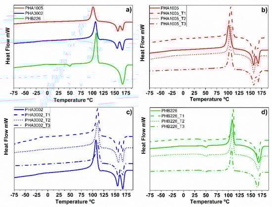 Differential scanning calorimetry (DSC) thermograms. (a) Raw matrices: PHA1005, PHA3002 and PHB226; (b) PHA 1005 loaded with 3 wt.% T1, T2 and T3; (c) PHA 3002 loaded with 3 wt.% T1, T2 and T3; (d) PHB 226 loaded with 3 wt.% T1, T2 and T3.