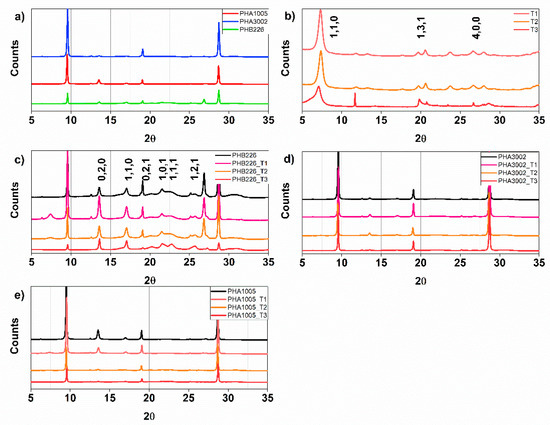 X-Ray diffraction patterns. (a) Raw matrixes: PHA1005, PHA3002 and PHB226; (b) Nanoclays: T1, T2 and T3; (c) Neat PHB226 and loaded with 3 wt.% T1, T2 and T3; (d) Neat PHA3002 and loaded with 3 wt.% T1, T2 and T3; (e) Neat PHA1005 and loaded with 3 wt.% T1, T2 and T3.