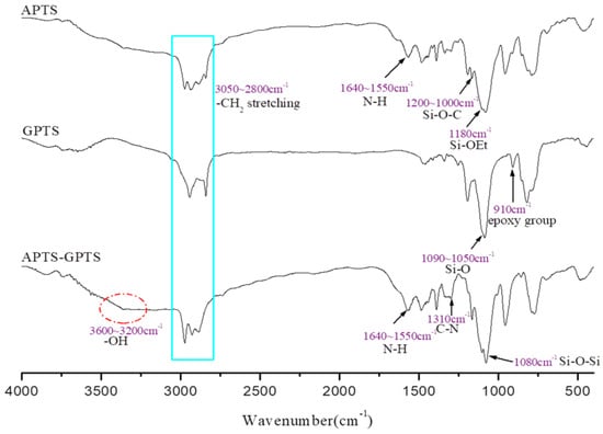 As shown in Figure 3, the characteristic absorption peak of CH2 stretching on the APTS spectrum appeared at 3050–2800 cm−1 [16,21], and those of N-H, Si–O–C, and Si–OEt were at 1640–1550 cm−1 [22,23], 1200–1000 cm−1 [24], and 1180 cm−1 [25], respectively. Moreover, the characteristic absorption peak of the oxirane ring group on the GPTS spectrum was at 910 cm−1 [14,15]. After the ring opening reaction between APTS and GPTS, the spectra clearly showed the disappearance of the oxirane ring and the appearance of a C–N characteristic absorption peak at 1310 cm−1 [19], revealing that APTS-GPTS underwent a successful ring opening reaction. Moreover, the APTS-GPTS spectrum retained the characteristic absorption peaks originally on the APTS and GPTS spectra, also confirming the success of the reaction.