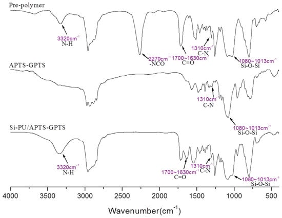 Figure 4 shows that the -NCO functional group of the prepolymer at 2270 cm−1 [17] and the -OH functional group of APTS-GPTS at 3600–3200 cm−1 [11,12] reacted. Because the -NCO functional group fully reacted with the -OH functional group, the -NCO functional group on the Si-PU/APTS-GPTS spectrum disappeared and the N-H characteristic absorption peak became more evident at 3320 cm−1 [18]; other functional groups originally on the prepolymer and APTS-GPTS spectra were also present. This demonstrated that the Si-PU/APTS-GPTS hybrid material had been successfully fabricated.