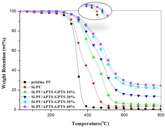 Figure 6 and Table 2 show the changes in the decomposition curves. The temperature (Td5) of pristine PU was 273 °C when the weight loss was 5%. After APTS-GPTS was added to Si-PU, and as the concentration of APTS-GPTS increased, Td5 increased considerably to 330 °C (Si-PU/APTS-GPTS 40% composite) when the weight loss of the hybrid material was 5%. As the concentration of APTS-GPTS increased, the char yield increased, particularly at 800 °C. The char yield increased from 0.7 wt% for pristine PU to 24.7 wt% for the Si-PU/APTS-GPTS 40% composite. This can be attributed to the surface migration of Si in the APTS-GPTS structure when APTS-GPTS underwent thermal decomposition [30,31]. The surface migration generated a compact SiO2 structure to protect the internal part of the material. The benzene ring contributed to the char yield; therefore, the char layer featured oxidation resistance to prevent combustion. Figure 6 shows the large differences in weight retention between different samples, revealing that APTS-GPTS increased the thermal stability of Si-PU.