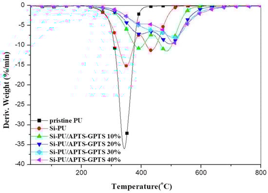 The derivative thermogravimetric curves are displayed in Figure 7. As shown, as the temperature changed, the temperature of maximum degradation rate of pristine PU was 343 °C. As the concentration of APTS-GPTS increased, the temperature of maximum degradation rate increased to 508 °C (Si-PU/APTS-GPTS 40%). Moreover, maximum degradation rate for pristine PU was −36 wt %/min. After adding APTS-GPTS, it effectively slowed down to −9.6 wt%/min and greatly slowed down the rate of thermal degradation. The above proved that the addition of APTS-GPTS nanoparticles could effectively improve the thermal stability of hybrid materials.