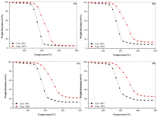 Based on the substitution of the TGA curves, calculated data were obtained using Equation (3). The calculated data were then compared with the experimental data to understand whether the data exhibited a positive deviation when APTS-GPTS was added to polymer materials. A positive deviation denoted a favorable interaction between the organic and inorganic phase. The equations for the calculated data are as follows [33]: