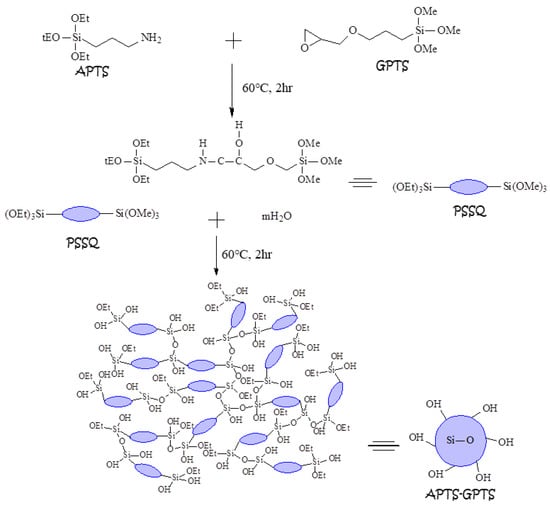 APTS (1.55 g) and GPTS (1.65 g) were added to a 100-mL serum vial with 80 mL of THF solvent for agitation; after reacting for 2 h, Solution A was obtained. Next, the THF solvent was added to 0.72 mL of deionized water and hydrogen chloride was instilled, and the pH value was adjusted to 4, thereby obtaining Solution B. Finally, Solution B was slowly instilled into Solution A and underwent a sol–gel reaction for 2 h at 60 °C to obtain APTS-GPTS, the reaction of which is shown in Scheme 2.
