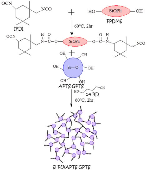 Prepolymer (28.88 g) was added to 80 mL of THF solvent and APTS-GPTS (19.8 g) was slowly instilled and left for 2 h to react to observe whether the viscosity had increased and the fluid level had decreased. After the viscosity had increased, the mixture was poured into a Teflon mold. The mold was first placed in the vacuum oven for deaeration for 24 h. Once the temperature was 80 °C, it was then placed in the cyclic oven for 24 h. Once the temperature had reached 80 °C, the finished product was then removed from the mold and cooled to room temperature, thereby completing the preparation of Si-PU/APTS-GPTS. The reaction of Si-PU/APTS-GPTS is shown in Scheme 3.