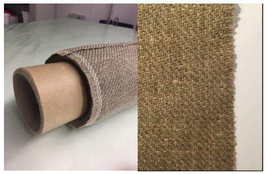 A commercial bidirectional flax fabric was obtained from Libeco, Meulebeke, Belgium (with an areal density of 550 g m−2) (Figure 1). The average tensile strength and modulus of a single-strand flax yarn were determined to be 153.8 ± 17.5 MPa and 16.4 ± 1.2 GPa, respectively. The polymer matrix was epoxy resin (Prime 20LV resin, Gurit) and the fast hardener (Prime 20 hardener, Gurit). Two fire retardants used for this work were ammonium polyphosphate Exolit® AP 462 produced by Clariant, Muttenz, Switzerland [31] (chemical formula: [NH4PO3]n, n > 1000) and aluminium hydroxide produced by Merck Millipore, Darmstadt, Germany [32](chemical formula: Al(OH)3·xH2O).