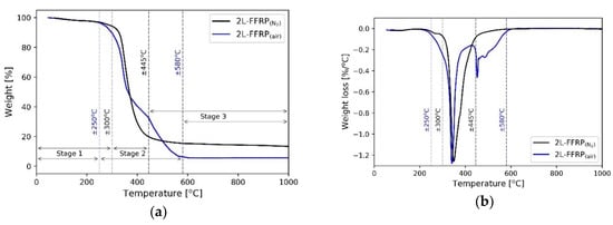 The thermal stability of 2L-FFRP composite tested in air and nitrogen atmosphere conditions: (a) thermogravimetric analysis (TGA) curves, (b) derivative thermogravimetric (DTG) curves.