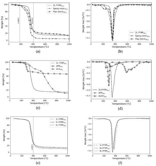 TGA and DTG curves in nitrogen atmosphere of FFRP composite with: (a,b) flax and epoxy components; (c,d) fire-retardant compounds; and (e,f) different number of layers.