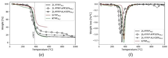 TGA and DTG curves of fire retardant FFRP composites: (a,b) ammonium polyphosphate (APP); (c,d) aluminium hydroxide (ALH); and (e,f) comparison to kenaf and glass fibre-reinforced polymer [47].