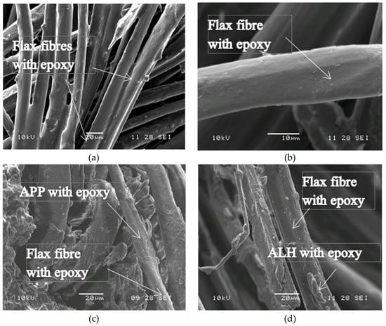 The morphology characteristics of the composites were investigated using scanning electron microscopy. The goal was to obtain visible information related to fire resistance. The results are presented in Figure 5. Based on the images, flax fibres in the composites without fire retardant compounds showed smooth surfaces that were fully covered with the adhesive (Figure 5a,b). Flax fabric is a natural material and it is naturally hydrophilic. APP and ALH have been also reported as super hydrophilic materials with water contact angle measurement approaching 0° [53,54]. Thus, the polarity of these materials supports their compatibility in the composites. The fibres in the composite treated with flame retardants had an inhomogeneous surface structure (Figure 5c,d). This inhomogeneity was suspected because of the presence of flame retardants that were mixed with epoxy resin. The aggregates of the particulate fire retardants were attached onto the surface of the fibre, which reduced the contact area between the epoxy resin and the flax fibre. This was suspected to be the main reason for the reduction of the mechanical properties as discussed in the previous section.