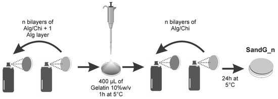An amount of 400 µL of an aqueous gelatin solution (10% w/v) was deposited on top of an Alg/Chi multilayer film ending in alginate with a number of bilayers of n + 1. Figure 1 shows the methodology employed to select the experimental conditions employed. The sample was maintained at 5 °C for 1 h to allow for the physical gelation of gelatin. Finally, a multilayer Alg/Chi film (n bilayers) was built on top of the gelatin gels. Samples were stored at 5 °C for 24 h before testing. The samples were designated as SandG_n where n denotes the total number of bilayers (10, 25 and 50).