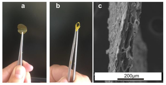 Figure 2a,b showed representative photographs corresponding to the sample SandG_25 where it can be observed that the coated LBL gelatin films retained the flexibility of the pristine gelatin film. The microstructure of the coated films was examined using a scanning electron microscopy (SEM) after lyophilization of the samples. Figure 2a,b shows representative photographs corresponding to the sample SandG_25. As it can be observed, the sample can be detached from the glass substrate where it was fabricated (Figure 2a) without any post-processing step. In addition, it can be easily handled with tweezers and retained the flexibility of the pristine gelatin film (Figure 2b). The morphology of the sample SandG_25 was also observed in cross section (Figure 2c), revealing a porous microstructure throughout the sample with a heterogeneous pore size distribution. Such morphology is characteristic of lyophilized gelatin gels [23].