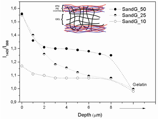Figure 5 depicts the ratio between the intensities of the Raman peaks located at 1409 cm−1 and 998 cm−1 (I1409/I998) for SandG samples as a function of the depth starting from the surface up to 8 μm within the sample. The value corresponding to GelG was also added in the plot for comparison. As can be observed, SandG_25 and SanG_50 samples showed a drastic decrease in the intensity ratio (I1409/I998) up to ~2 µm depth. From this value up to 8 µm, the intensity ratio (I1409/I998) for SandG_50 reached a plateau whereas the intensity ratio (I1409/I998) corresponded to the sample SandG_25 continued to decrease and the values obtained tended to be those exhibited by GelG. For the sample SandG_10 the intensity ratio (I1409/I998) did not change with the depth. Recent results published on LBL Alg/Chi films prepared under the same experimental conditions employing an automatic LBL coater have revealed that the thickness corresponded to Alg/Chi films with 25 bilayers was 350 nm [22]. Therefore, from the results obtained, this suggested that there was a high degree of interpenetration of the polysaccharide coating within the gelatin gel because of the presence of polysaccharide chains entangled within the gelatin gel which was much more evident within the first three microns of the sample for the samples SandG_25 and SandG_50. On the contrary, SandG_10 sample seemed to be whole fully interpenetrated because no drastic changes in the intensity ratio were shown as a function of depth. A schematic representation of the structural organization of the LBL coated gelatin gels is shown as an inset of Figure 5.