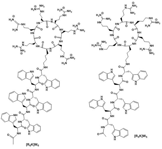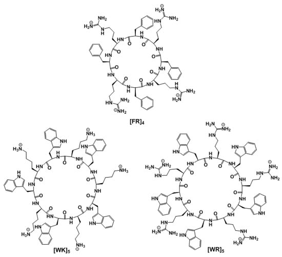 We have previously reported several cyclic peptides with cell penetrating properties [,,,]. The linear peptides are usually more susceptible to hydrolysis by peptidases when compared with the cyclic peptides. Furthermore, the cellular uptake of many linear cell-penetrating peptides occurs predominantly through an endocytic pathway. On the other hand, cyclic peptides containing alternate tryptophan and arginine residues [WR]5 and [WR]4, and the corresponding peptide-capped gold nanoparticles were found to act as efficient molecular transporters of siRNA in human cervix adenocarcinoma (HeLa) cells. The mechanism of uptake for [WR]4 and [WR]5 was found to be endocytosis independent, since no significant difference in cellular uptake was observed in the presence of different endocytic inhibitors []. Flow cytometry studies showed that [WR]5 and [WR]5-capped gold nanoparticles improved the intracellular uptake of siRNA by about 2- and 3.8-fold versus siRNA alone. We also found out that both delivery platforms were less toxic when compared to lipofectamine. Fluorescence microscopy data confirmed the localization of fluorescence-labeled siRNA in cytoplasm in the presence of [WR]5 and [WR]5-capped gold nanoparticles []. Thus, we hypothesized that the positively charged residues on the peptide can have electrostatic interactions with negatively charged phosphate residues in the phospholipid bilayer and siRNA. Furthermore, the hydrophobic tryptophan groups could interact with hydrophobic residues in the lipid membrane.