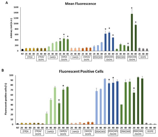Similar N/P ratios were used for hybrid peptides, and the effect of the addition of DOPE to the delivery system was also investigated. Both peptides demonstrated significant efficiency in delivering siRNA to different breast cancer cell lines, and similar to our observation for [WR]5, the addition of DOPE increased the mean fluorescence for both peptides (although not always statistically significant in MDA-MB-468 cells; Figure 3). However, the efficacy of siRNA uptake with the peptides in this class seemed to depend on the cell line: while both peptides created similar mean fluorescence readings to in MDA-MB-231 cells, addition of DOPE had a more significant effect on improving the internalization level with [R6K]W6 compared to [R5K]W5 at N/P ratios of 40 and 80 (mean fluorescence of 1359 compared to 671 for N/P ratio of 40, respectively; Figure 3A). On the other hand and in AUC65 cells, [R5K]W5 created higher mean fluorescence, both with and without DOPE (mean fluorescence readings of 1942, 921, and 1392 for N/P ratios of 20, 40, and 80 with DOPE, respectively, compared to 472, 611, and 1237 for corresponding N/P ratios for [R6K]W6; Figure 3E). However, there was no significant difference between the overall mean fluorescence values observed for the two peptides in MDA-MB-468 cells (Figure 3C). Interestingly, the effect of N/P ratio on the siRNA internalization levels was also cell type dependent: while the highest mean fluorescence was observed with highest N/P ratio in MDA-MB-468 cells (for both peptides, with and without DOPE), a similar trend was not observed in the other two cell lines. In MDA-MB-231 cells, N/P ratio of 40 provided the highest N/P ratio for both peptides (not significantly different with N/P ratio of 20 in [R5K]W5 with DOPE). On the other hand, more variability was observed in AU565 cells, where the highest mean fluorescence was observed for N/P ratios of 80 and 20 for [R5K]W5 with and without DOPE, respectively, and N/P ratio of 80 for [R6K]W6 both with and without DOPE. Statistically significant differences were less frequent in terms of percentage of the cells positive for fluorescence signal, mostly due to high percentages observed for most study groups (Figure 3B,D,F). However, a trend similar to the mean fluorescence values was observed in the percentage of fluorescence-positive AU565 cells (Figure 3F).