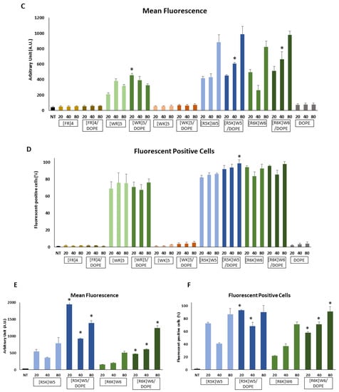 The efficacy of siRNA cell internalization with designed pepties (with and without addition of DOPE) in MDA-MB-231 Cells (A,B), MDA-MB-468 (C,D), and AU565 cells (E,F; only for [R5K]W5 and [R6K]W6 with different N/P ratios (20:1, 40:1, and 80:1) (Flow cytometry; n = 3). The uptake is presented as both mean fluorescence in the whole cell population (A,C,E) and percentage of cells identified as fluorescent positive (B,D,F). The “DOPE” group represents internalization of siRNA with DOPE alone. The error bars indicate standard deviation. Asterisks indicate significant difference (p < 0.05) with the ‘without DOPE’ corresponding group.