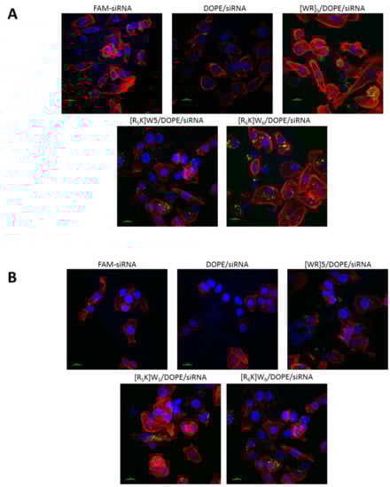 To evaluate the cytotoxicity of [WR]5, [R5K]W5, and [R6K]W6 alone (without siRNA complexation) in healthy cells, cell viability assay was conducted in LLCPK (normal kidney cells) at the experimental concentration of 25 μM. None of the compounds showed any significant cytotoxicity at this concentration in the selected cell line (data not shown).