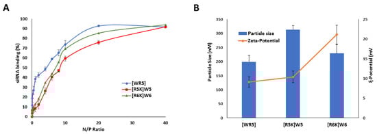 Characterization of peptide interactions with siRNA: (A) The binding affinity was determined at different N/P ratios to determine the N/P ratio required for 50% binding (BR50), using SYBR Green II exclusion assay (n = 3). Among the selected peptides, [WR]5 showed the highest binding affinity to siRNA; (B) Particle size, and surface charge of the particles were determined at an N/P ratio of 20 (Zeta Sizer; n = 3). [R5K]W5 and [R6K]W6 showed the highest particle size and surface charge, respectively, among the peptides included in this study.