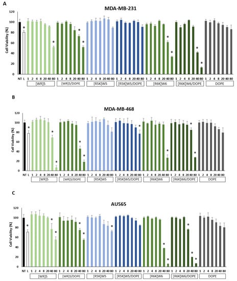 The toxicity of [WR]5 (with and without addition of DOPE) in (A) MDA-MB-231 Cells, (B) MDA-MB-468, and (C) AU565 cells with different N/P ratios (from 1 to 80) (CCK assay; n = 3). The viability is normalized to cells treated with normal saline (no treatment, or ‘NT’ group). DOPE study group received DOPE alone, with the same final concentration incorporated in the delivery system at corresponding N/P ratios. The error bars indicate standard deviation. Asterisks indicate significant difference (p < 0.05) with the ‘NT’ group.