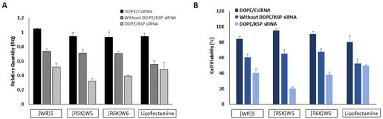 KSP has been identified as a viable target for siRNA silencing as a therapeutic approach in cancer therapy. Delivering siRNA via a variety of delivery systems targeting KSP in different cancer types has shown effective apoptosis induction and tumor growth retardation in vitro and in vivo [,,,,,]. In fact, clinical trials have indicated the efficiency of simultaneous silencing of KSP and vascular endothelial growth factor (VEGF) in colorectal [] and endometrial cancer patients [] with liver involvement. We selected KSP as a model protein to investigate silencing efficiency of the designed selected peptides in MDA-MB-231 cells, and to determine the effect of this silencing on the cell viability as the phenotypical end result of the siRNA delivery. While delivering KSP siRNA without DOPE had a modest effect on mRNA levels as well as the cell viability for all three peptides, the addition of DOPE enhanced the effect significantly in all study groups, which was most significant for [R5K]W5 (Figure 7). This is further confirmation of the efficient siRNA delivery via the designed peptides and timely release of siRNA from the complexes in the cytoplasm. Although [R6K]W6 showed the highest level of siRNA cellular internalization among the designed peptides in this cell line with N/P ratios of 40 and 80, the lower silencing efficiency of this peptide is not surprising due to the lower N/P ratio selected to avoid non-specific toxicity.