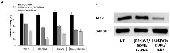 A similar study design was used to investigate targeting JAK2 protein in the same cell line, and in addition to the real-time PCR, western blot was performed to confirm the effect of siRNA delivery on the protein expression level (Figure 8). The analysis of mRNA levels of JAK2 in different study groups revealed a similar pattern to our observation for KSP. Again, delivering siRNA without DOPE decreased the mRNA level compared to scrambled siRNA for all selected peptides, and adding DOPE to the delivery system further enhanced this effect significantly, which was again a silencing efficiency that was significantly higher than Lipofectamine, for both [R5K]W5 and [R6K]W6. [R5K]W5/DOPE again showed the most significant drop in mRNA level (~80% silencing; Figure 8A). This delivery system was selected for western blotting to confirm our observations at the protein level (Figure 8B).