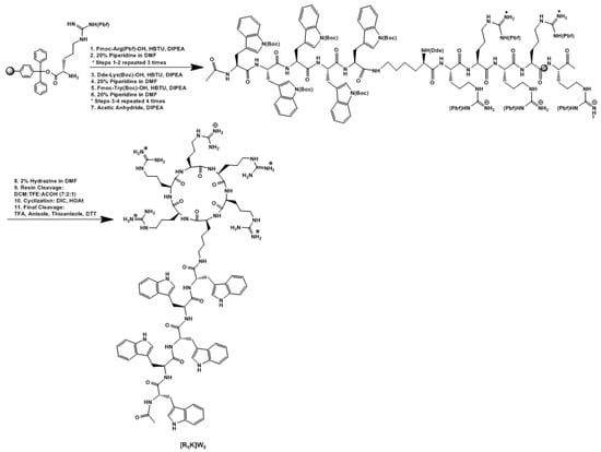 As a representative example, the synthesis of [R5K]W5 is shown in Scheme 1. Synthesis of [R5K]W5 was performed by using Fmoc solid-phase peptide synthesis. The appropriate resin, H-Arg(Pbf)-2-chlorotrityl resin was used as the solid support. Fmoc-Trp(Boc)-OH, Fmoc-Arg(Pbf)-OH, and Dde-Lys(Boc)-OH were used as building block amino acids in the assembly of the peptide on the resin. After the protected linear peptide formation was confirmed by MALDI mass spectroscopy (see Supporting Information), the crude peptide was used for the cyclization reaction in the presence of anhydrous DMF, anhydrous DIC, and HOAt. The crude peptide was precipitated in cold diethyl ether and was purified by HPLC.