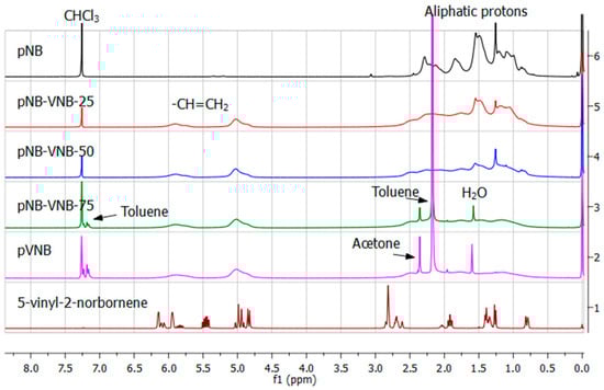 The solubility of the polymers after drying proved to be challenging. pNB, pNB-VNB-25 and pNB-VNB-50 were soluble in chloroform. pNB-VNB-75 and pVNB were stored in solution as they would become insoluble after drying. As a consequence, not all solvent could be removed, resulting in large residual solvent signals in the NMR spectra (Figure 2). The 1H NMR spectra showed that the polymers were monomer free as no sharp correlating monomer signals are present in the polymer spectra. Also, by equalizing the vinyl proton signal intensity (4.5–6.5 ppm), a gradual decrease in aliphatic signals (0.5–2.5) is visible. This indicates that an increasing amount of VNB to NB is built in, which is in accordance with the monomer composition. The integration of the signals indicate that for pNB-VNB-25 and for pNB-VNB-50 respectively about 31% and 55% VNB was built in (Figures S10 and S11). These values may be slightly overestimated due to the presence of solvent signals in the aliphatic region (e.g., water).