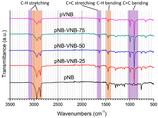 The free-standing membranes were analyzed by Fourier-transform infrared spectroscopy (FT-IR) (Figure 3). Analyzing the spectra with increase in VNB content, it is clear that the purple regions, related to the unsaturated C=C and C–H bonds, increase in intensity while the orange regions, related to the saturated C–H bonds, decrease in intensity. This confirms the conclusion from the NMR spectra: NB-VNB copolymers can be synthesized by controlling the VNB content in the polymerization feed.