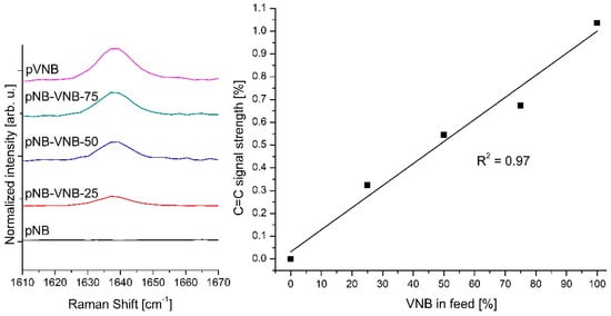 Raman, which is highly sensitive to the C=C stretching vibration, allow for a deeper analysis of the VNB content in the polymer membranes, by analyzing the relative changes in the C=C signal at 1637 cm−1. For this, the Raman spectra were recorded across different VNB feed concentrations using their common and invariant CHx signatures just below 3000 cm−1 and were subsequently normalized. As such, the relative intensity of the C=C signal in the material can be quantified and compared directly. This analysis is presented in Figure 4, which exhibits a near perfect correlation between VNB content in the monomer feed and the C=C signal strength at 1637 cm−1. This correlation is in accordance with the VNB content analysis by NMR signal integration for pNB-VNB-25 and pNB-VNB-50. Such an approach may facilitate a direct means of analyzing the VNB content when such details are not known.